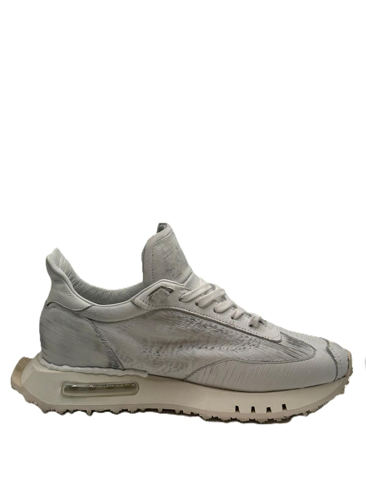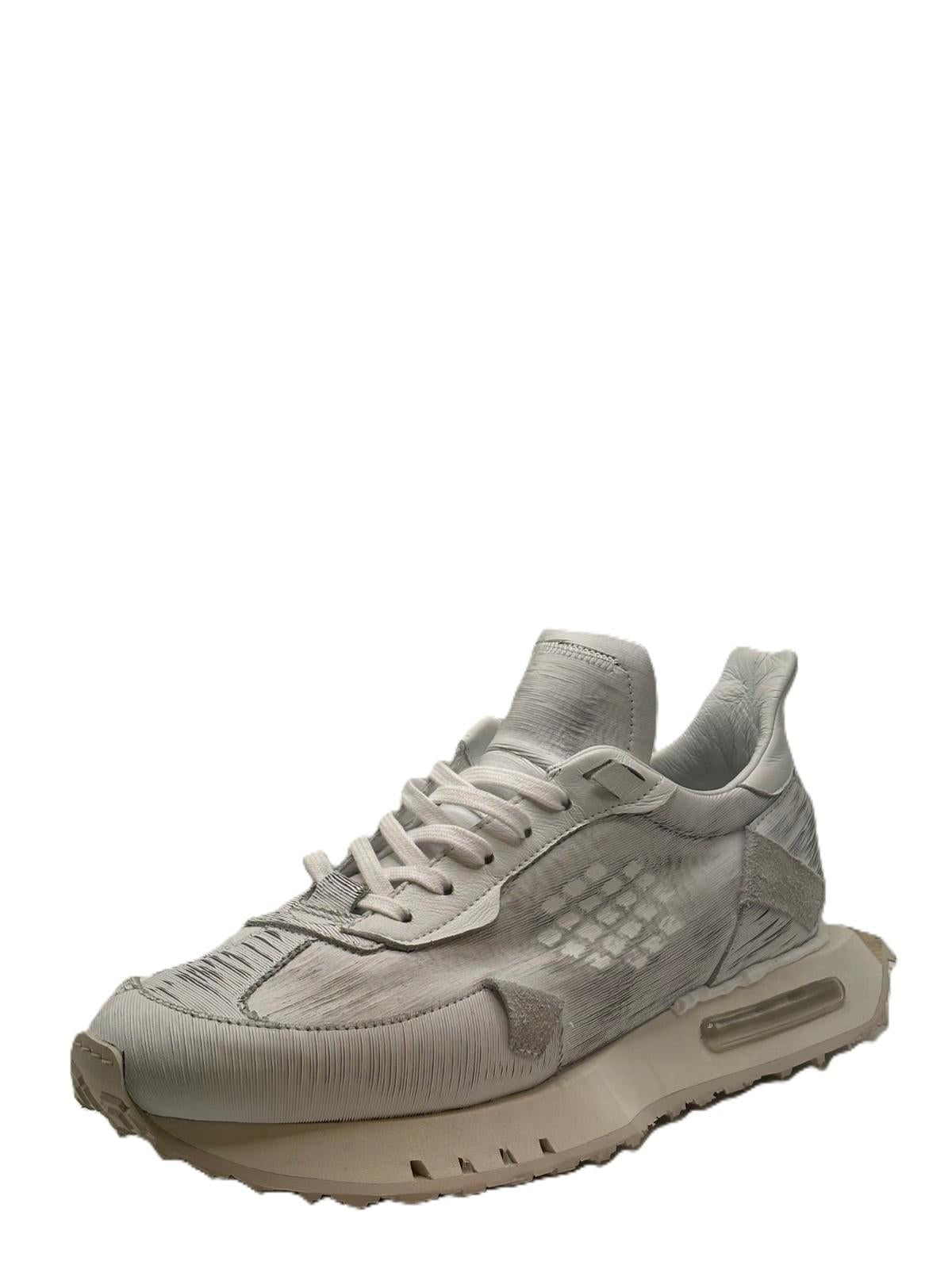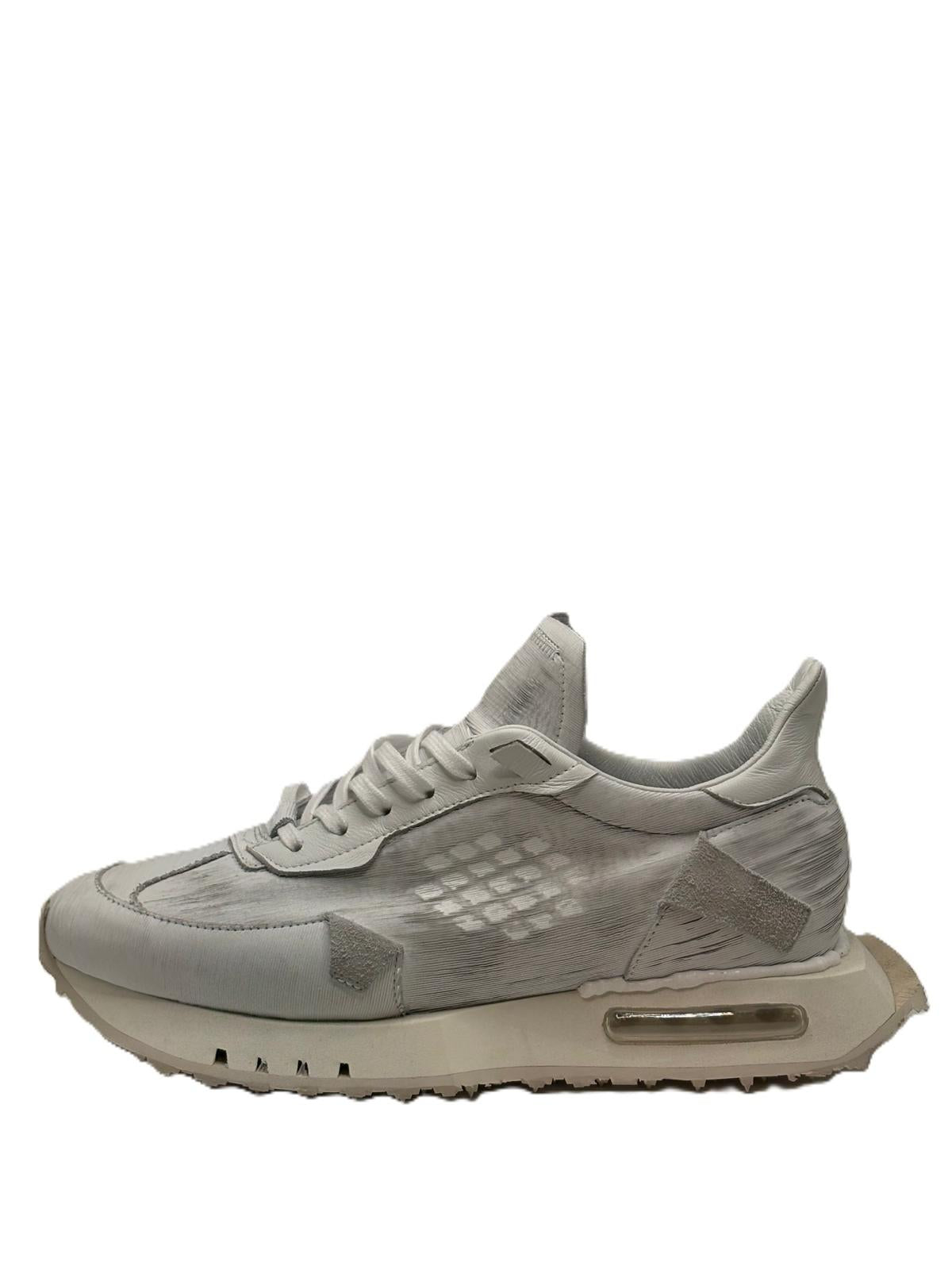 Sneaker artigianale realizzata interamente in Italia con pelle bianca tagliata a laser, caratterizzata da una costruzione solida e ben strutturata. La tomaia in pelle offre resistenza e adattabilità al piede, mentre la struttura garantisce una calzata stabile e confortevole. La suola in gomma con sistema ammortizzante assicura supporto e comfort prolungato durante l'uso quotidiano. Le lavorazioni manuali rendono ogni paio unico.