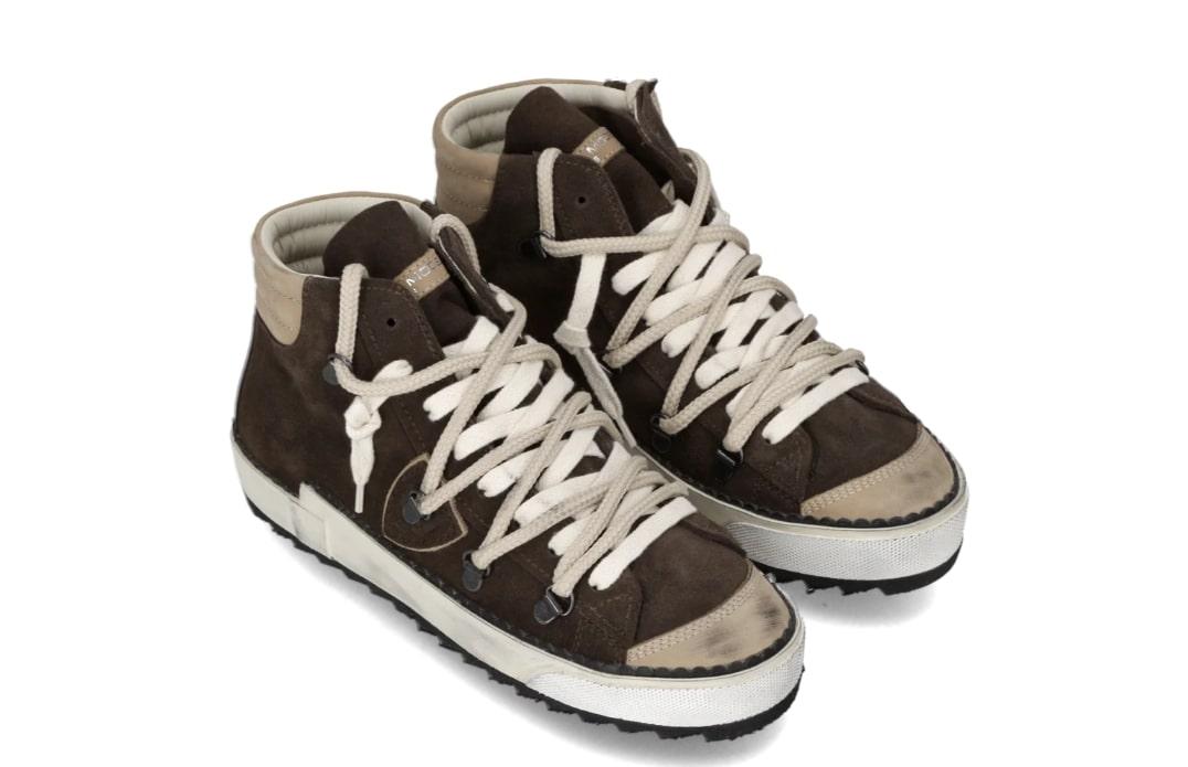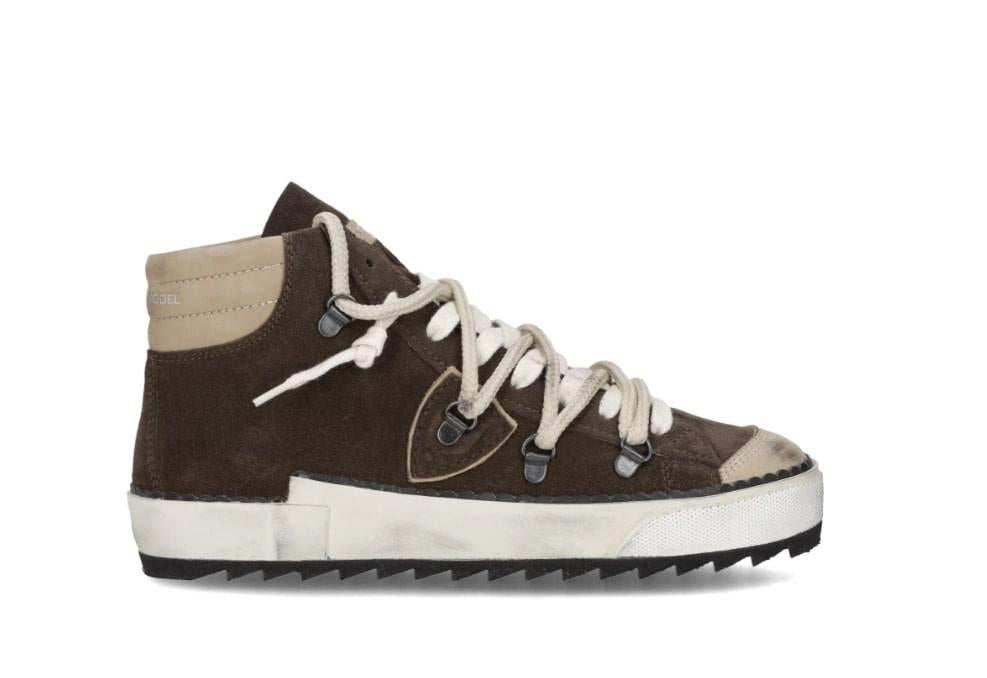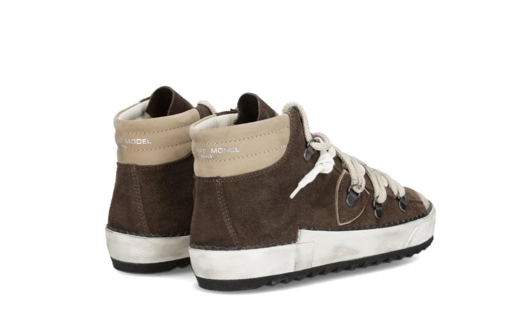 Sneaker donna alta in pelle e suede marrone, dallo stile raffinato e versatile. Ideale per outfit autunnali o look casual sofisticati.