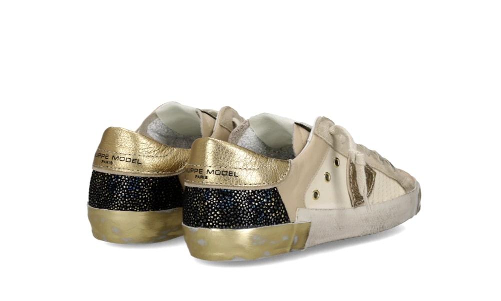 Un mix di materiali e un gioco di contrasti che rendono unica un'icona. La tomaia abbina pelle e suede, pattern metal sul tallone e dettagli e cuciture sui toni del nero e dell'oro. La costruzione rimane quella iconica con scudetto embossed sul lato e fasciatura artigianale della suola con sporcature e dettagli oro.
