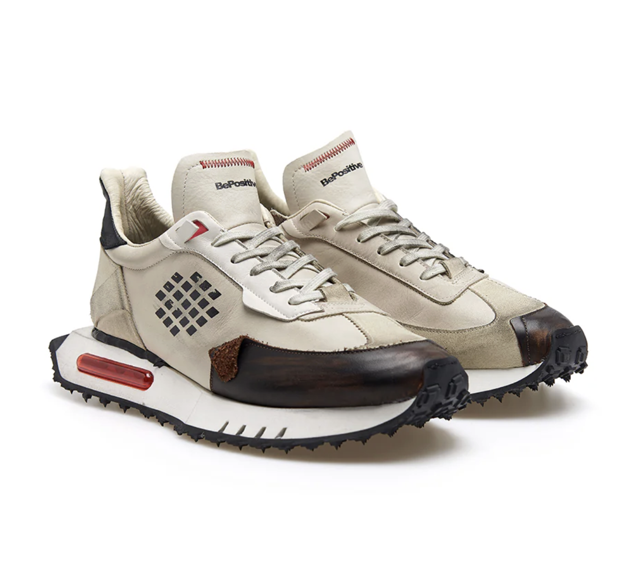 Versione Race 01 con pelle bianca e dettagli scuri: la combinazione cromatica neutra rende questa sneaker elegante e facile da abbinare. Il design Heritage di BePositive si esprime in un look raffinato e pulito, con suola in gomma e dettagli curati.